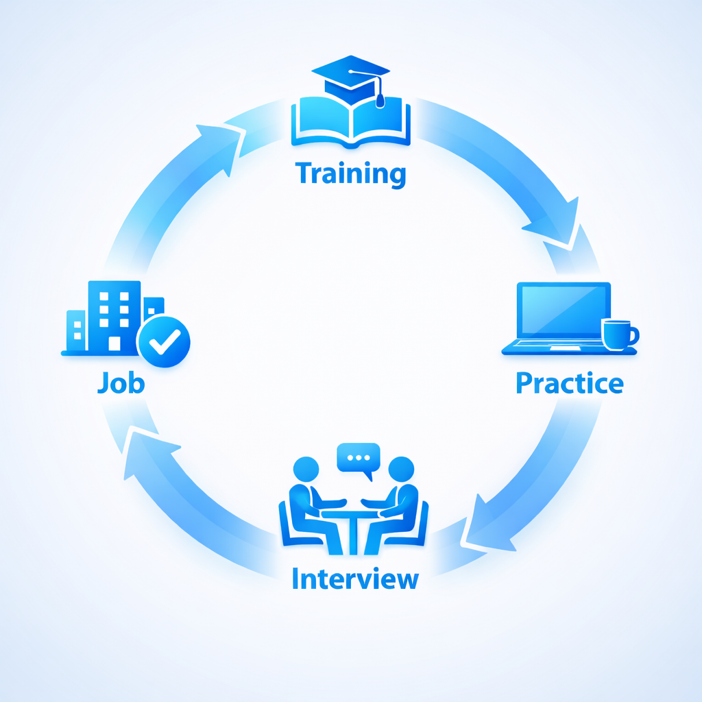 As a career training institute, we guide students step by step from basic learning to interview readiness. Our training includes practical sessions, mock interviews, project work, and continuous support until students gain confidence.